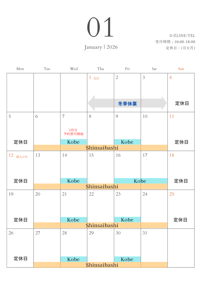 通常毎月1日に2か月先のご予約受付を開始しておりますが、年始のため1/7(水)より3月分のご予約開始とさせていただきます。